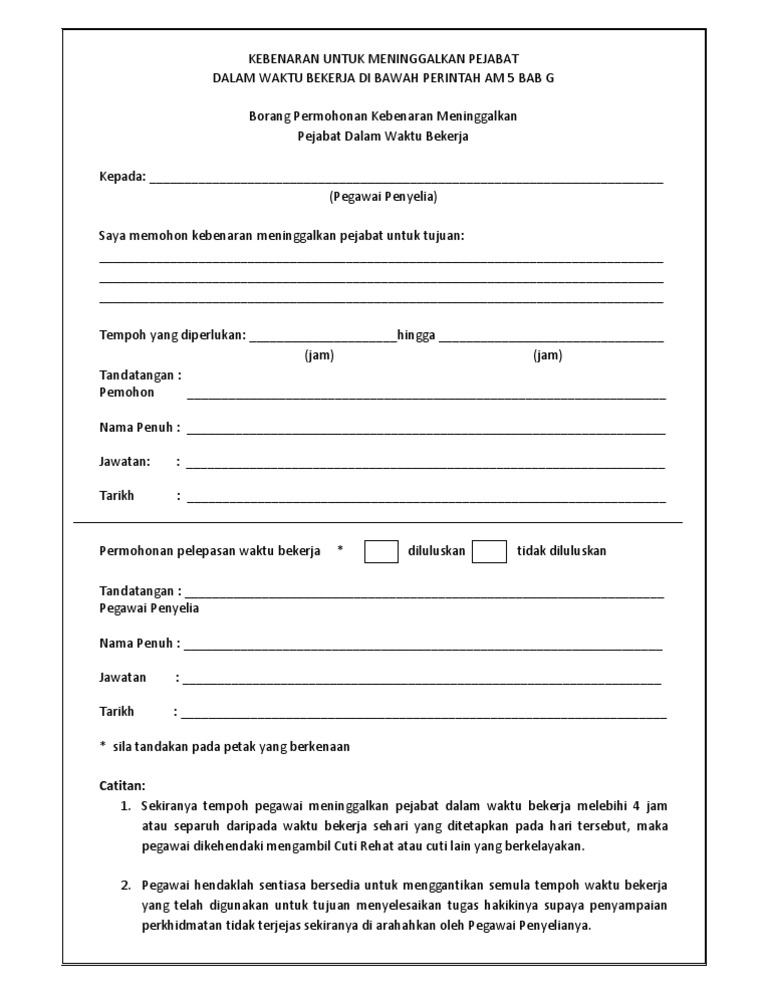 Borang Kebenaran Keluar Pejabat Atas Urusan Rasmi - Permohonan membawa fail keluar dari kawasan pejabat.. Muat turun borang permit pergerakan perintah. Borang kebenaran keluar negara borang kebenaran keluar negara atas urusan rasmi dan atas urusan persendirian adalah berbeza 3. Permohonan cuti tanpa gaji (borang pejabat/borang pejabat). Permohonan keluar pejabat atas urusan rasmi (borang pejabat/borang pejabat). Borang permohonan keluar negeri (urusan rasmi).