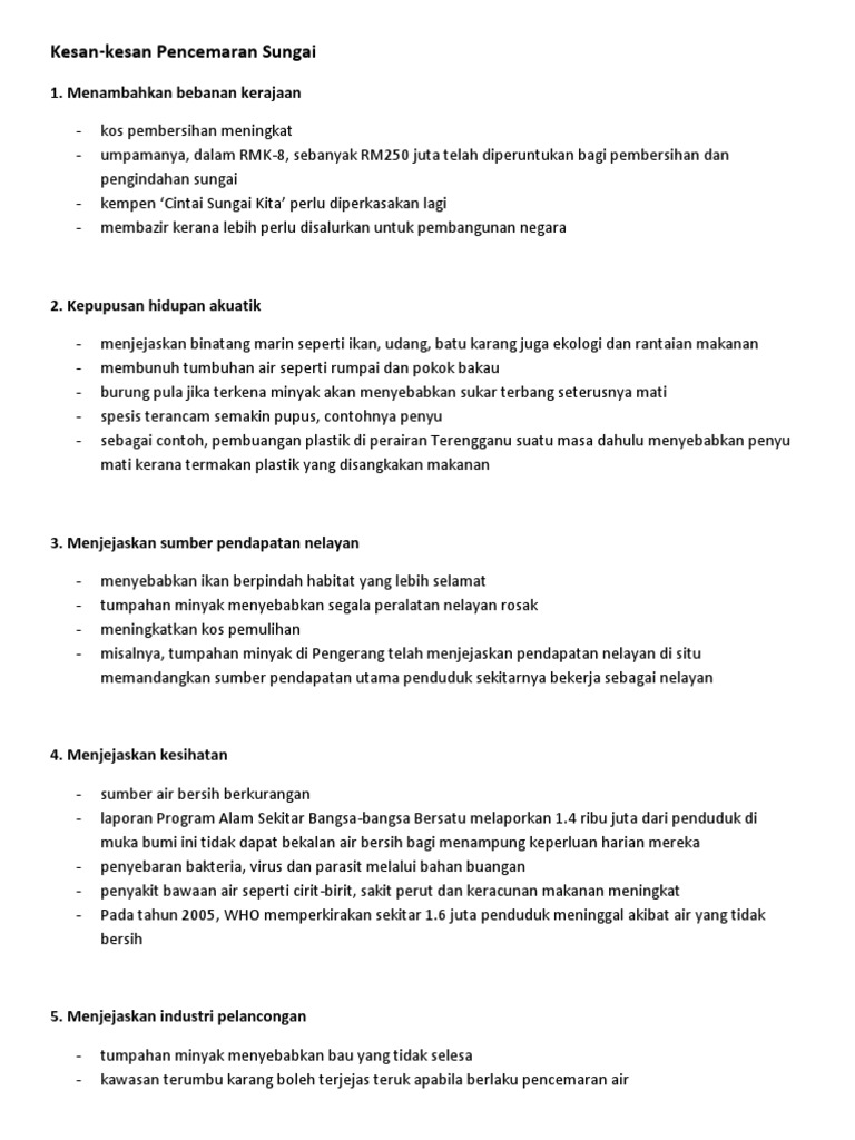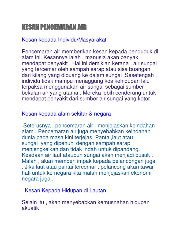 Kesan Pencemaran Alam Sekitar Karangan Stpm from slidetodoc.com Air yang tercemar mengandungi bahan kimia seperti sodium, nitrat, merkuri dan sebagainya yang boleh memudaratkan kesihatan manusia. Kesannya ialah manusia akan dijangkiti pelbagai penyakit. Sampah sarap dari rumah menyumbat sistem pengaliran air. Persoalannya, apakah kesan pencemaran air? Hal ini demikian kerana, air sungai yang tercemar oleh sampah sarap atau sisa buangan dari kilang yang dibuang ke dalam sungai. Pencemaran air ialah pencemaran yang berlaku di sungai, tasik, laut. Pencemaran air bermaksud perubahan yang berlaku dari segi kandungan,keadaan dan warna sehingga tidak sesuai dan akan memberi kesan terhadap manusia apabila digunakan. Kesimpulannya, pencemaran air berlaku berpunca dari manusia dan manusia jugalah yang perlu merancang dan bertindak bagi memastikan pencemaran air tidak menjadi teruk.