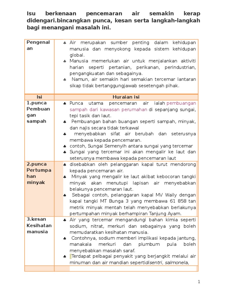 Punca Pencemaran Alam Sekitar Pdf from i1.wp.com Punca pencemaran pencemaran air terbahagi kepada dua iaitu punca tetap dan punca tidak tetap. Minyak yang tertumpah ke dalam air akan menhalang kemasukan udara di laut. Jenis pencemaran dan bahan yang mengakibatkan kesan terhadap kesihatan adalah seperti di bawah Contohnya, sodium memberi implikasi kepada jantung, manakala merkuri dan plumbum. Air yang bertakung menjadi tempat pembiakan nyamuk dan mikroorganisma, menyebabkan penyakit merebak. Air merupakan antara isu yang selalu meniti dari bibir ke bibir anggota masyarakat di negara kita. Tanpa air yang bersih manusia tidak bisa minum, mandi, memasak, mencuci dan lain sebagainya. Air yang panas selepas digunakan untuk menyejukkan mesin di power plant ini akan disalurkan semula ke laut.