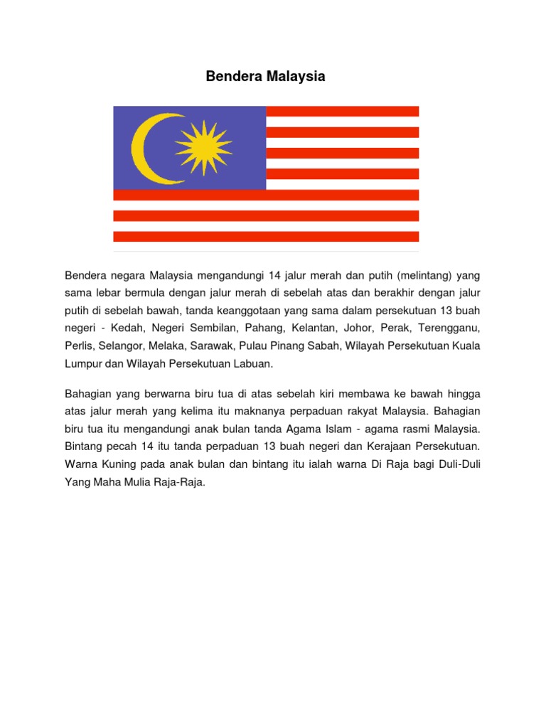 Anak bulan membawa maksud islam sebagai agama rasmi negara bintang pecah 14 menunjukkan perpaduan 13 buah negeri dan kerajaan persekutuan hargailah bendera malaysia kerana ia melambang sesebuah negara yang merdeka, untuk.
