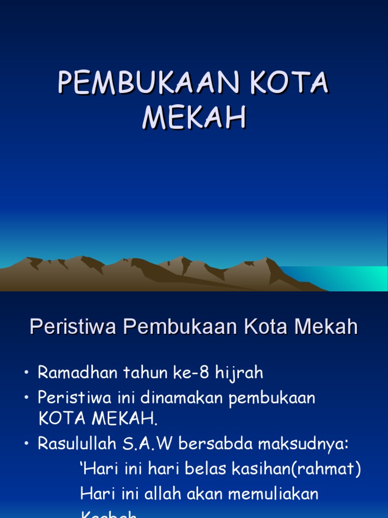 Peristiwa Pembukaan Kota Mekah : Pembukaan Kota Mekah Atau Dikenali Sebagai Ialah Peristiwa Penting Pembebasan - Saudaraku sekalian, pembukaan kota mekah bermaksud pembebasan kota mekah daripada pengaruh, amalan & cengkaman jahiliyah.